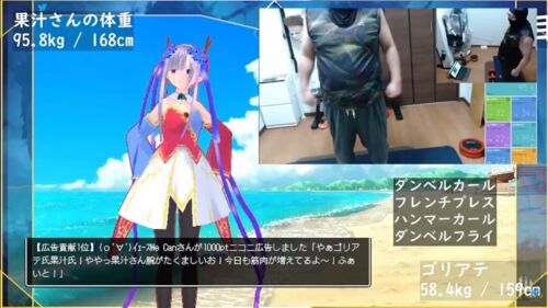 なんと果汁さんついに95.9kgになった!! そして最近参加し始めたまちおさん。彼の配信にはいつもツンツンにきつい事を言うリスナーがいる。 「まちお、ちゃんと呼吸しろや」 「腹出過ぎやろ」 「フォーム見てちゃんとやれや」 など毎回すげーきつい事いうな…